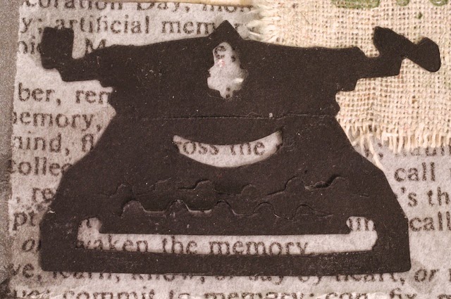 Dunque, torniamo alla mia versione: l'idea di partenza è stata la scrittura, volevo che i singoli pezzi avessero un'attinenza con la parola scritta. Pensa che ti ripensa sono partita dalla macchina per scrivere piccola, sempre di Tim Holtz e dal suo Tissue Wrap e da lì ho costruito il resto.